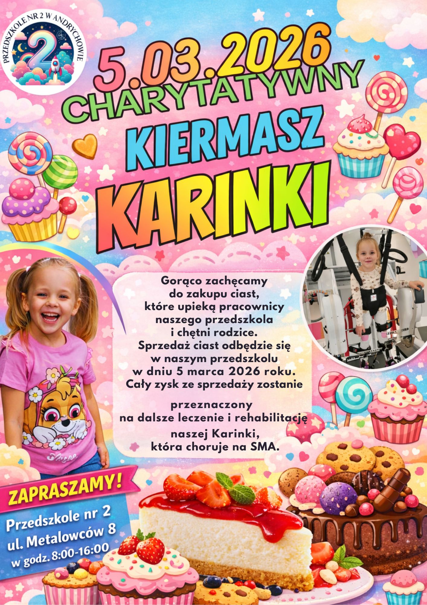 Przedszkole nr 2 w Andrychowie zaprasza na Charytatywny Kiermasz Ciast – Razem dla Karinki