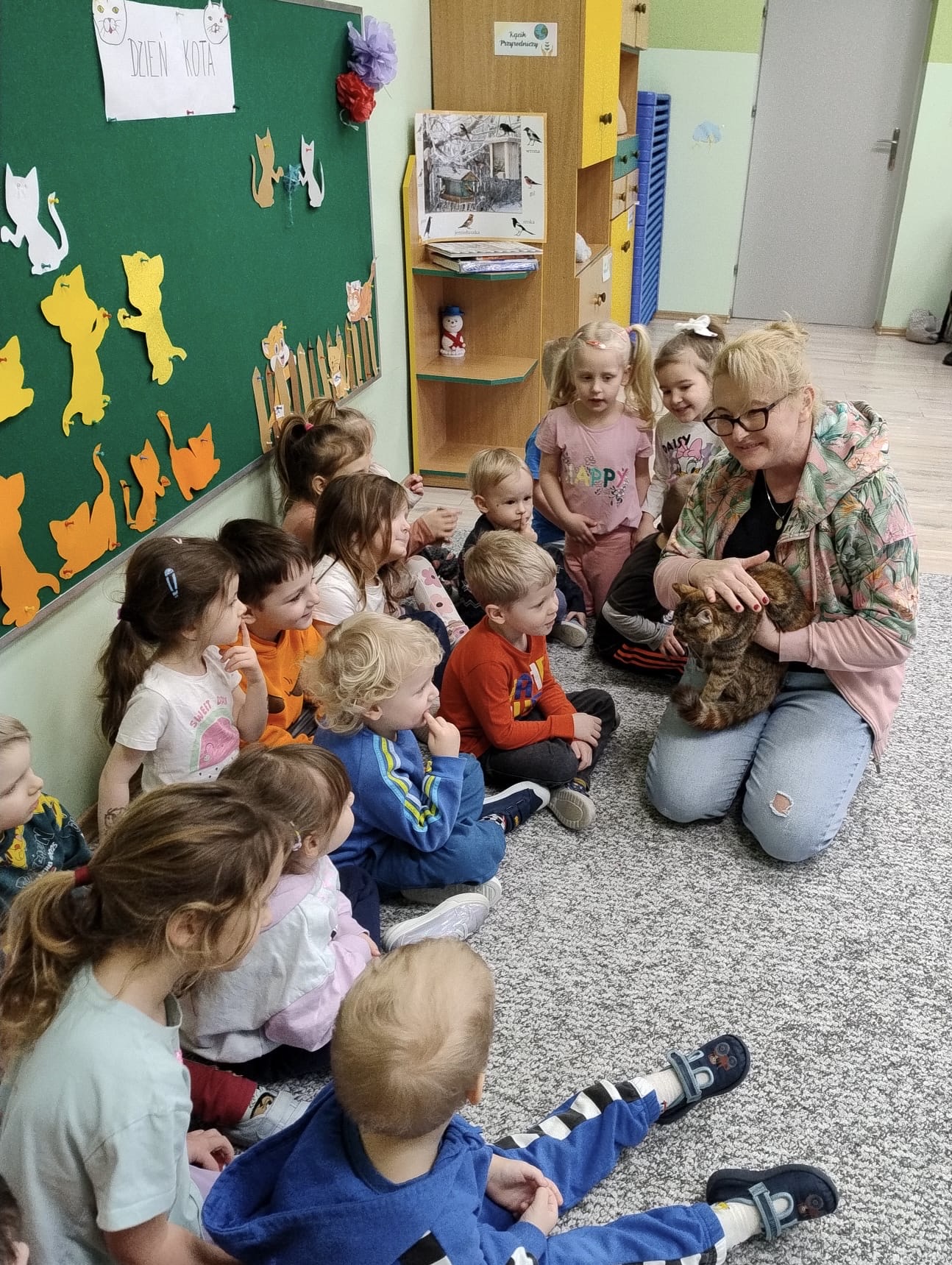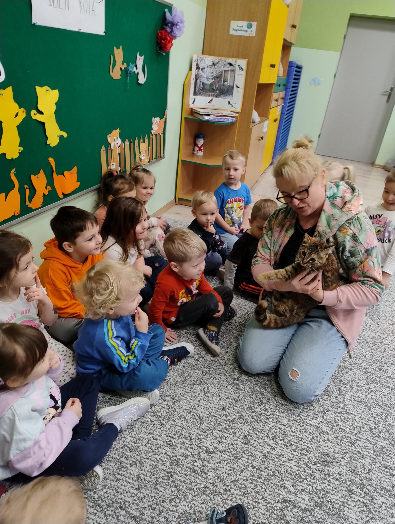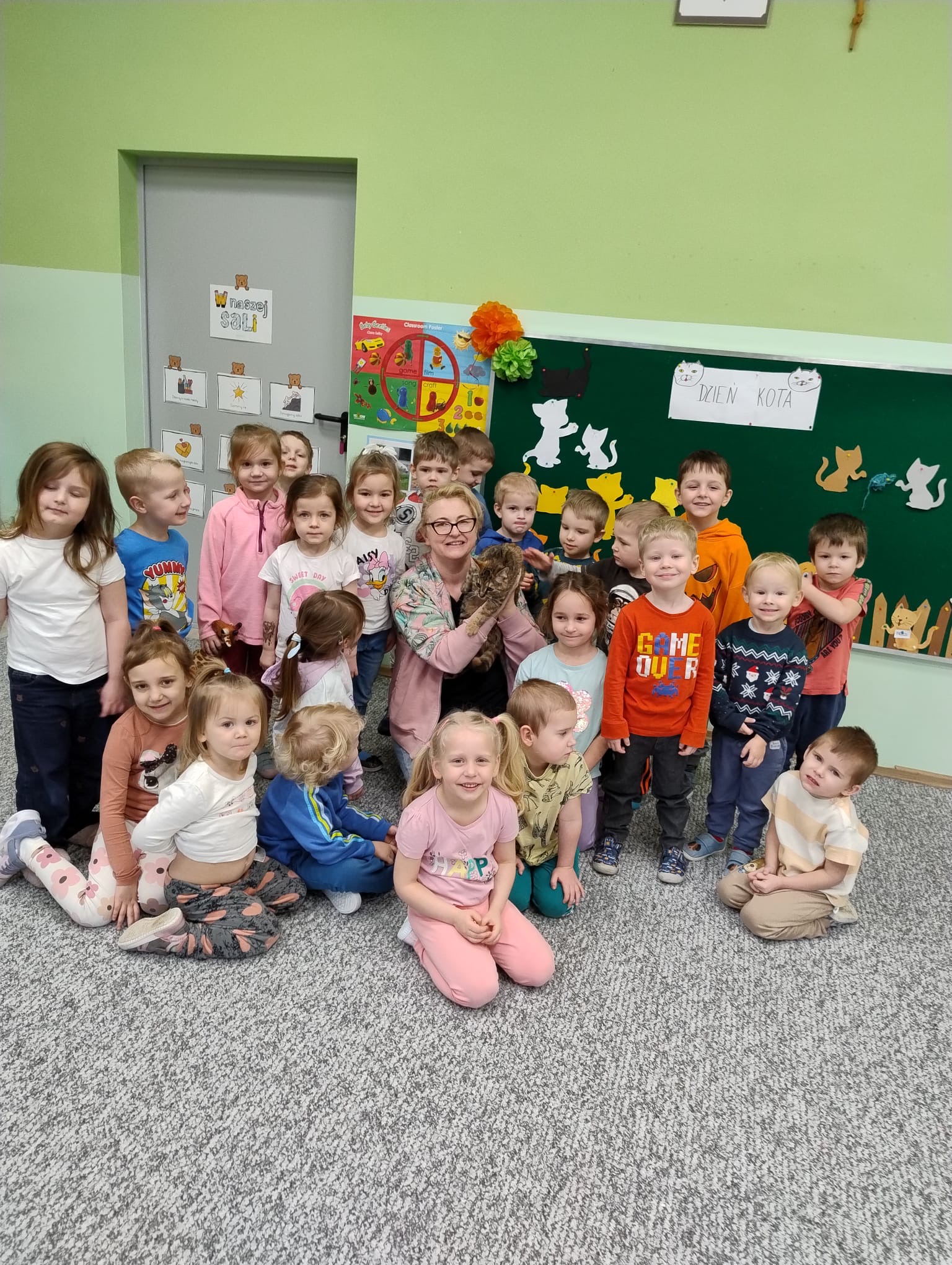 W naszym przedszkolu świętowaliśmy Dzień Kota. Z tej okazji odwiedził nas wyjątkowy, puszysty gość – prawdziwy kotek, który wzbudził ogromne zainteresowanie i radość wśród dzieci.