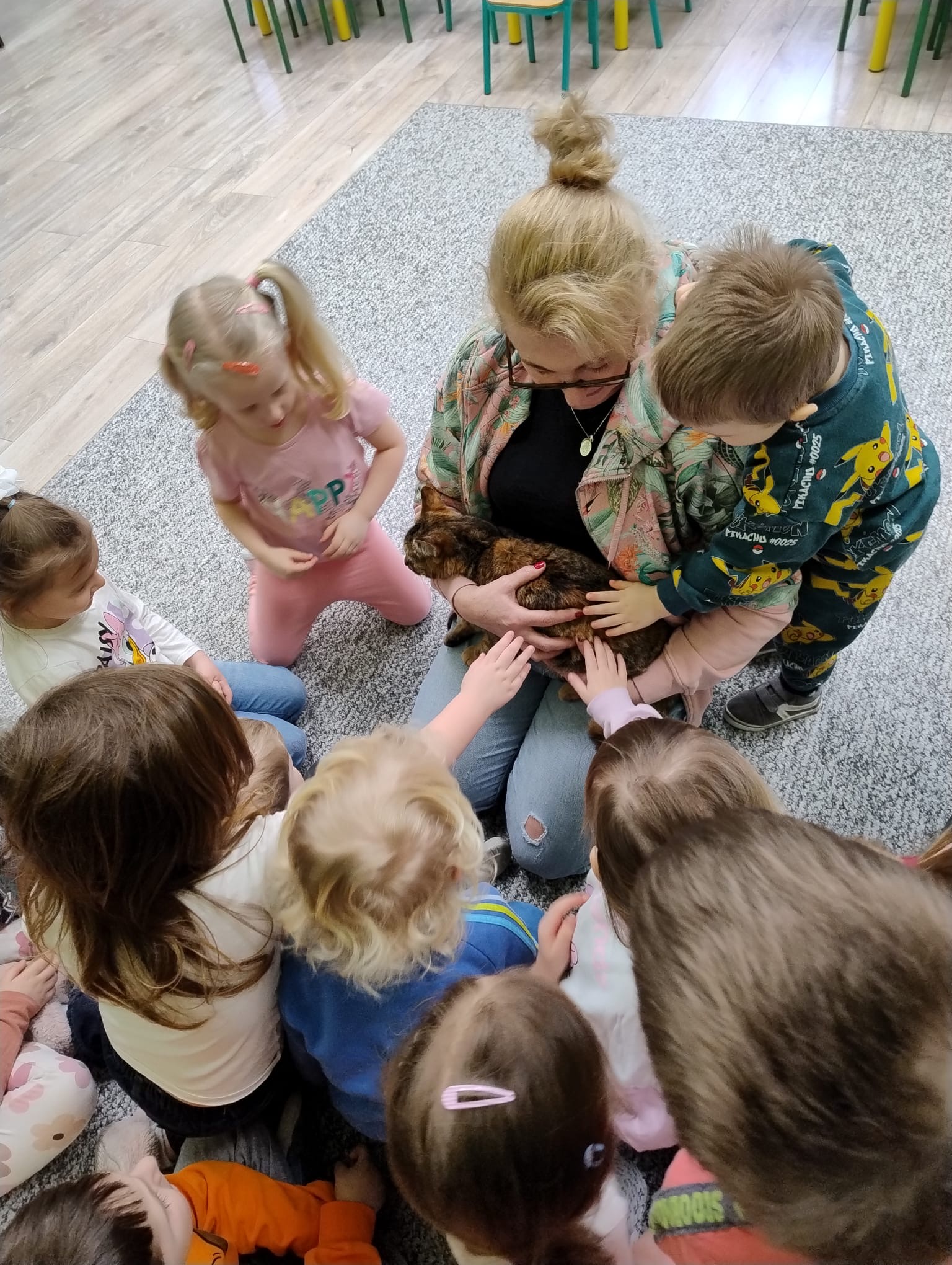 Podczas spotkania przedszkolaki dowiedziały się, jak należy opiekować się kotem, czym go karmić oraz jak bezpiecznie i odpowiedzialnie bawić się ze zwierzętami. Dzieci miały okazję pogłaskać kotka, obserwować jego zachowanie oraz zadać wiele ciekawych pytań.