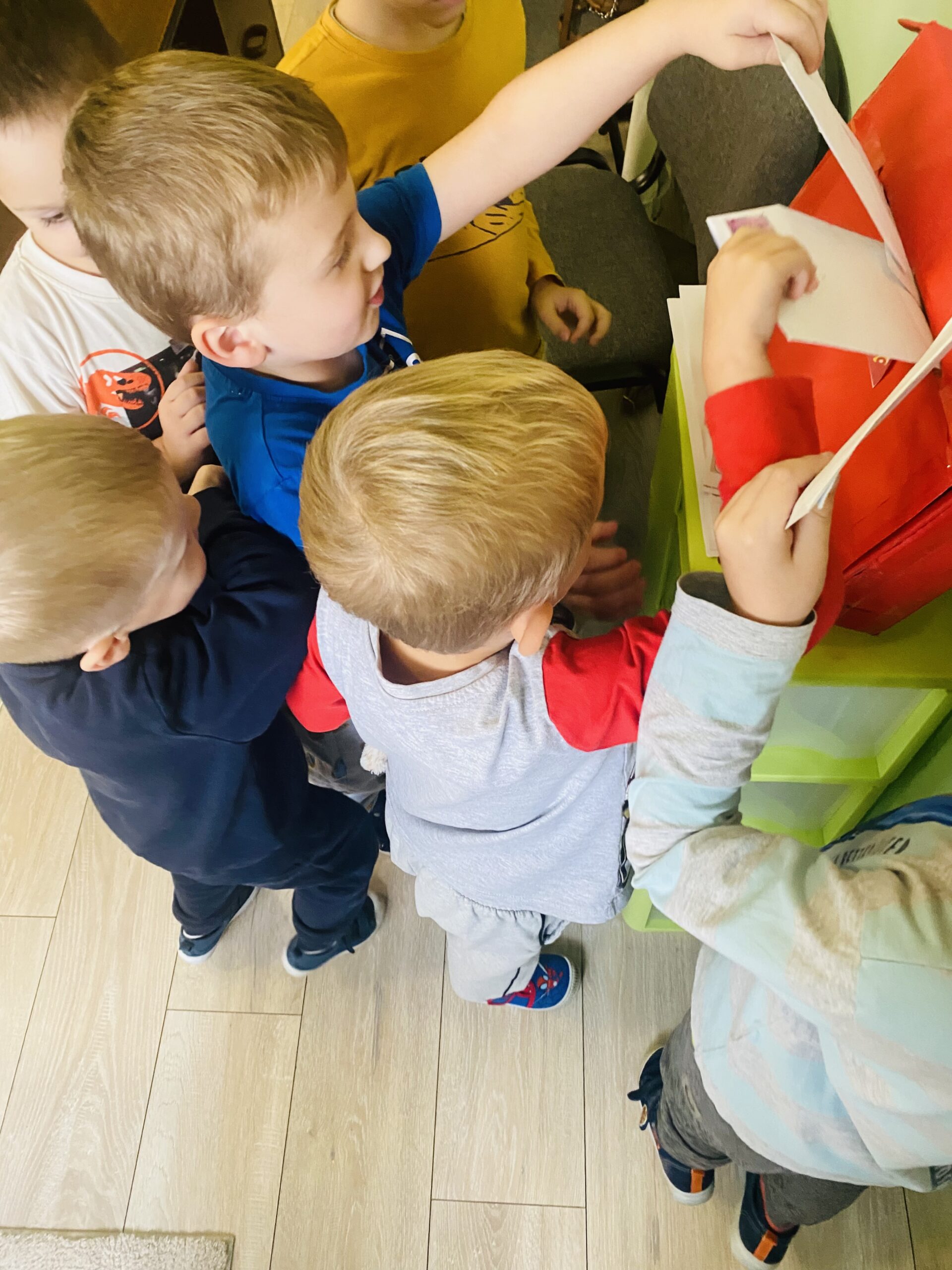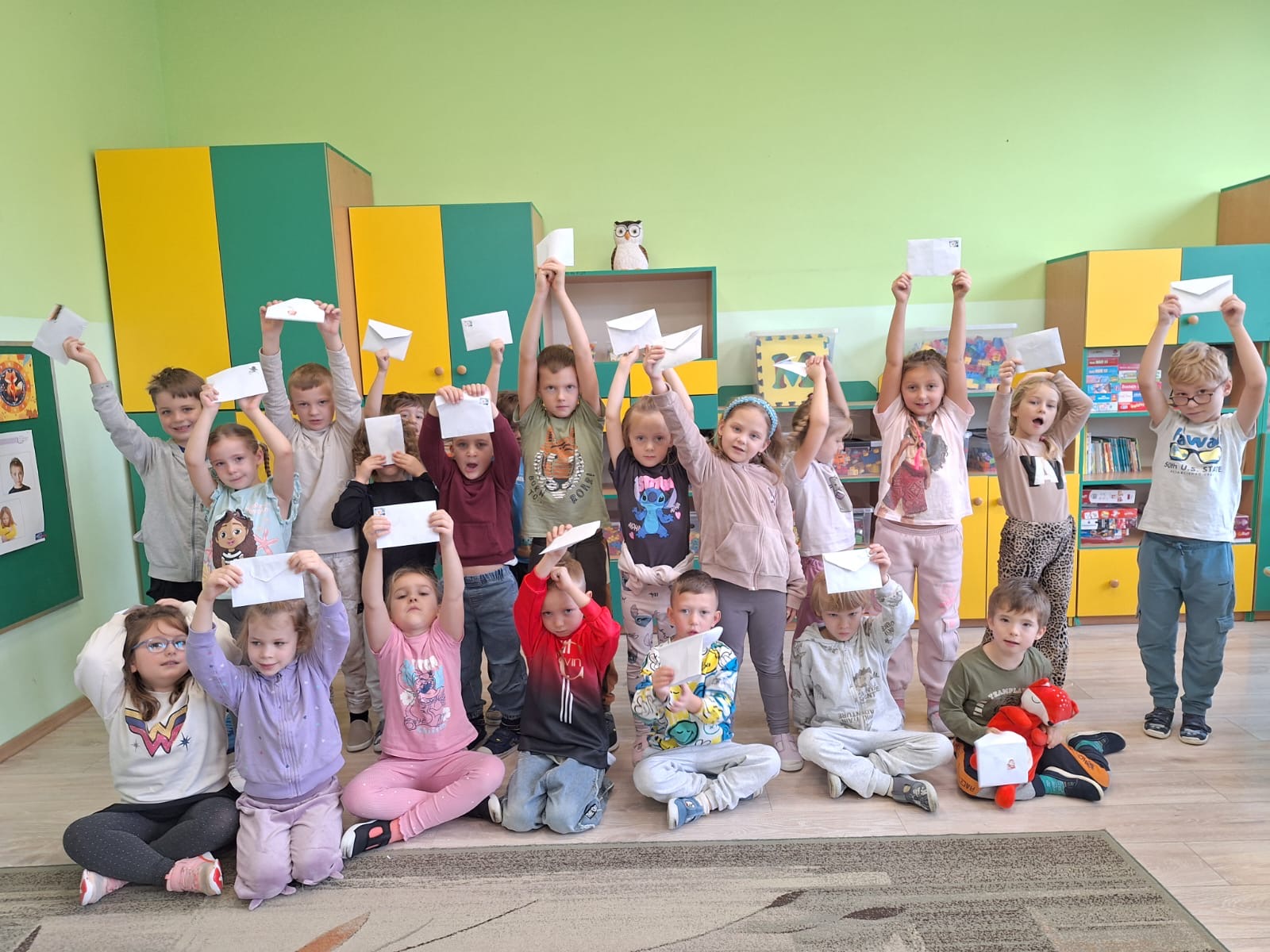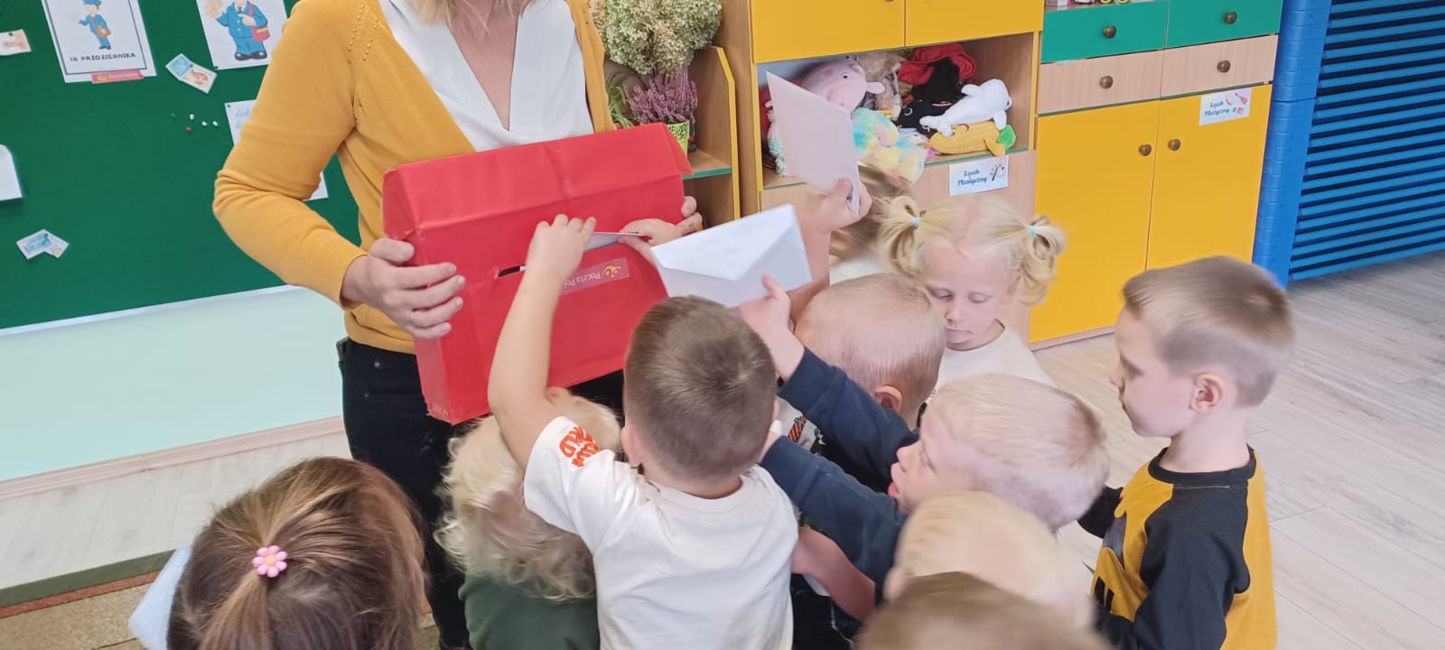 Dzieci poznały zawód listonosza, dowiedziały się, co nosi w swojej torbie i jak wygląda jego strój. Każde dziecko otrzymało kopertę ze znaczkiem pocztowym, którą mogło wrzucić do przygotowanej skrzynki pocztowej. W środku koperty była przygotowana mała niespodzianka dla każdego przedszkolaka 🙂