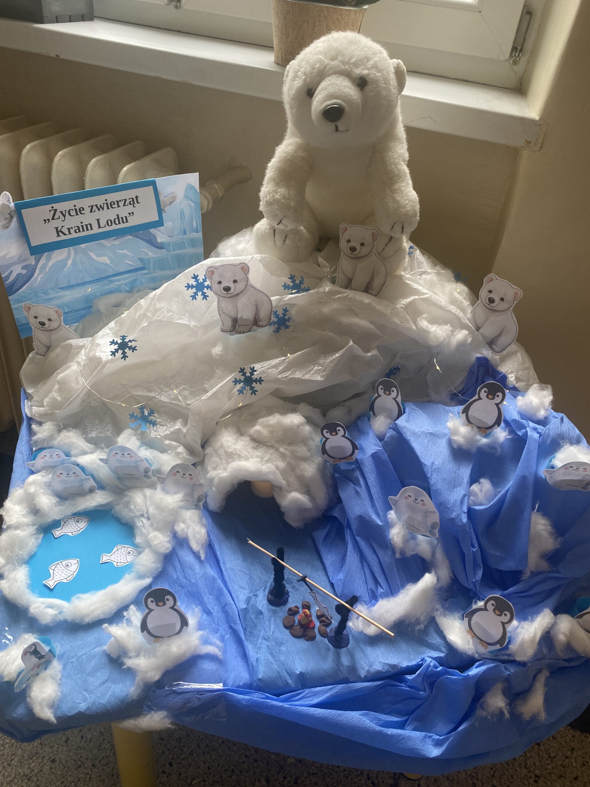 Powstała nawet makieta „zwierząt z krainy lodu” z niedźwiedziem polarnym w roli głównej. Podczas zajęć słuchaliśmy także odgłosów zwierząt polarnych i próbowaliśmy je rozpoznawać.