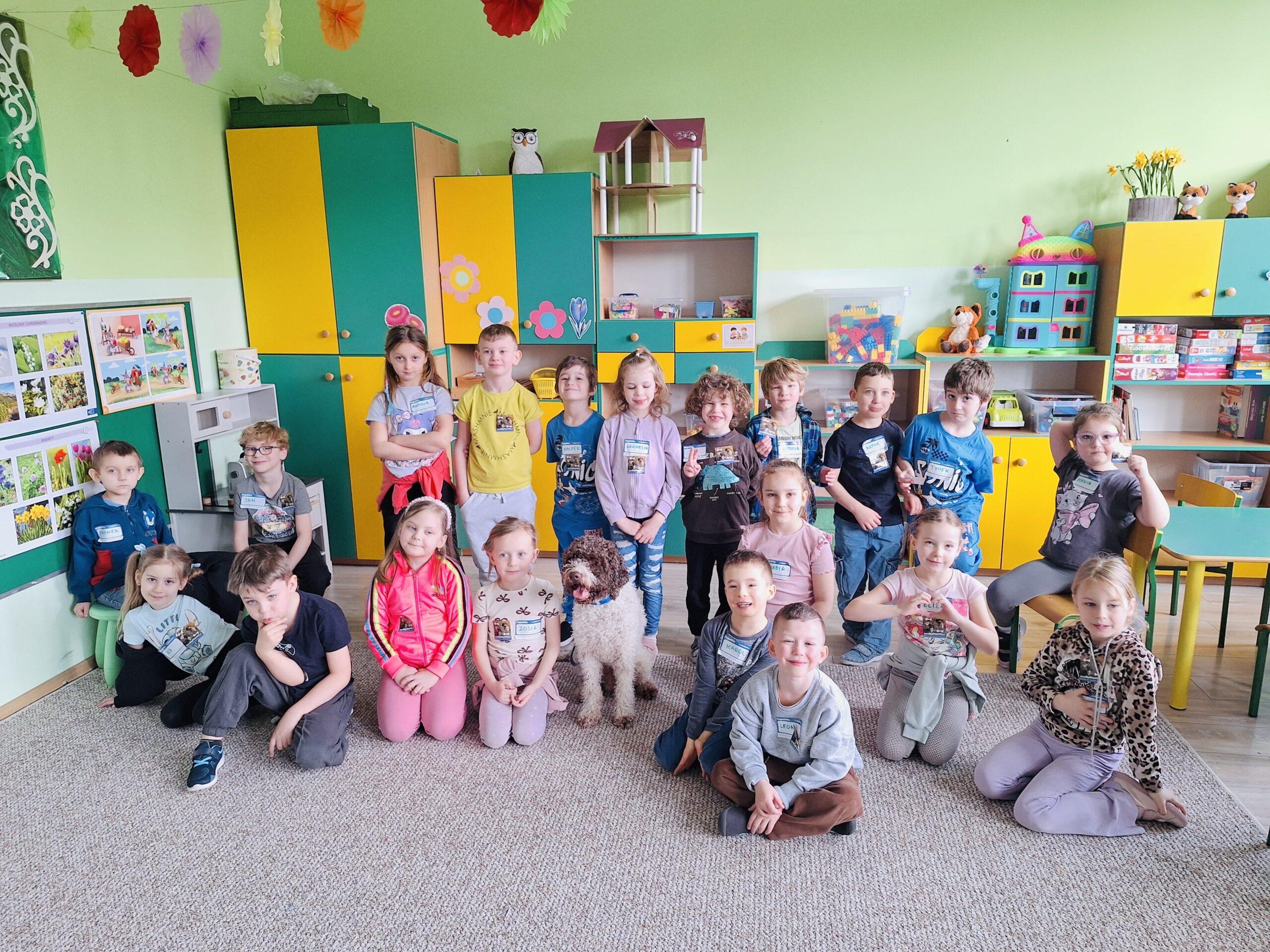 W naszym przedszkolu odbyło się wyjątkowe spotkanie z pieskiem Fado. Podczas wizyty dzieci miały okazję poznać go z bliska i dowiedzieć się, jak należy opiekować się psem.