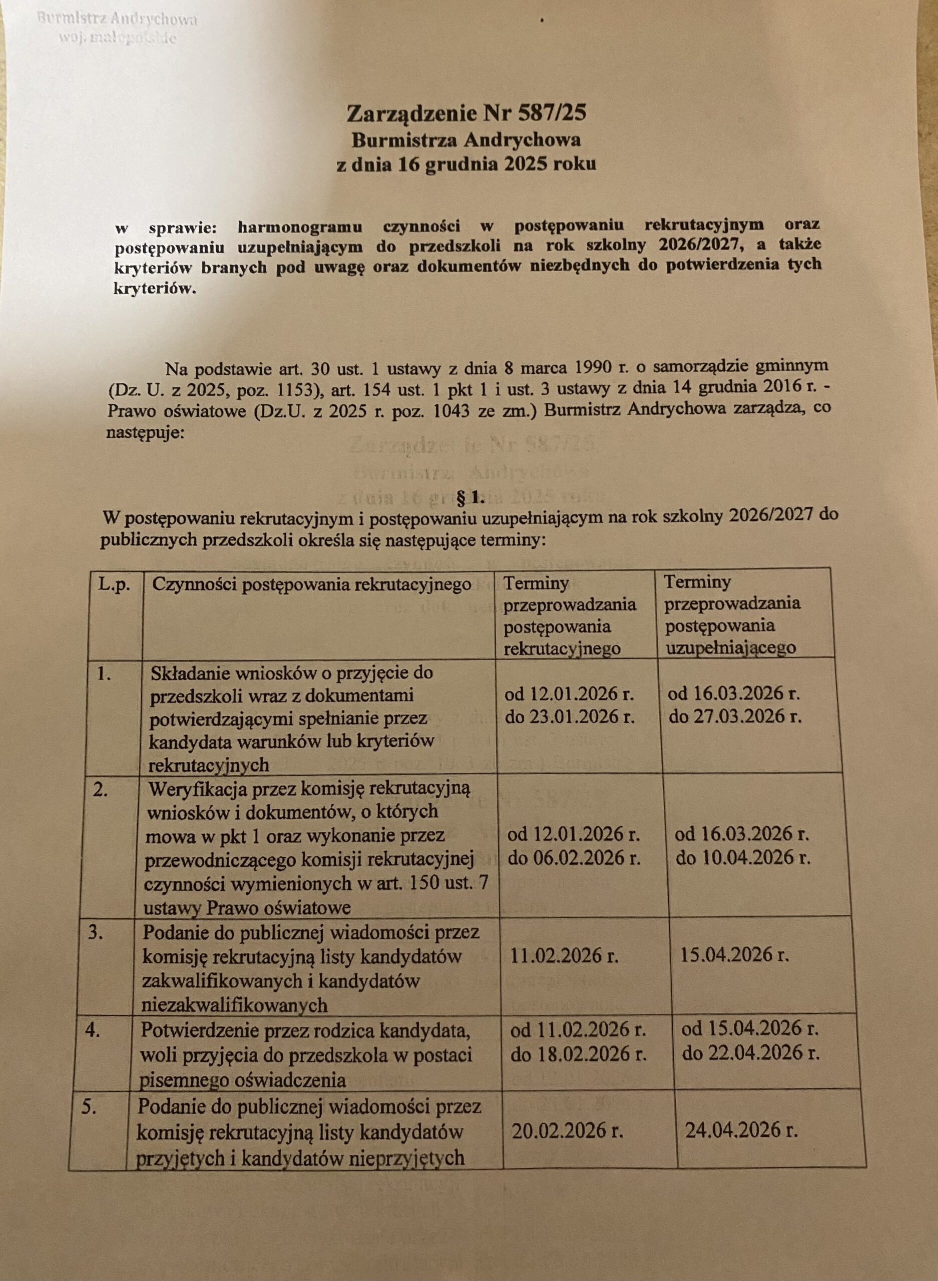 Terminy postępowania rekrutacyjnego i uzupełniającego zostały określone w Zarządzeniu Burmistrza Andrychowa  Nr 587/25 z dnia 16 grudnia 2025 roku w sprawie: harmonogramu czynności w postępowaniu rekrutacyjnym oraz postępowaniu uzupełniającym do przedszkoli na rok szkolny 2026/2027, a także kryteriów branych pod uwagę oraz dokumentów niezbędnych do potwierdzenia tych kryteriów.