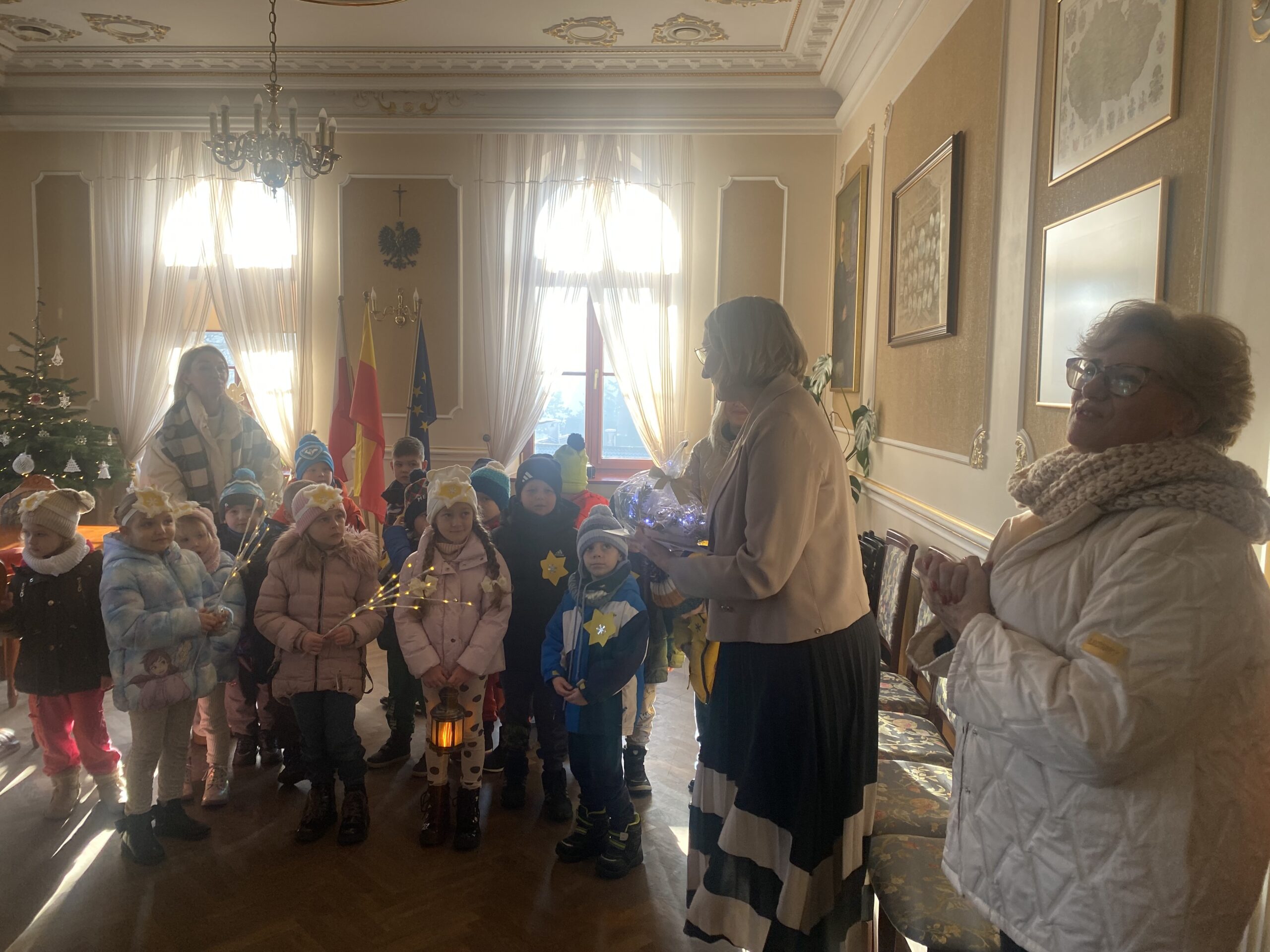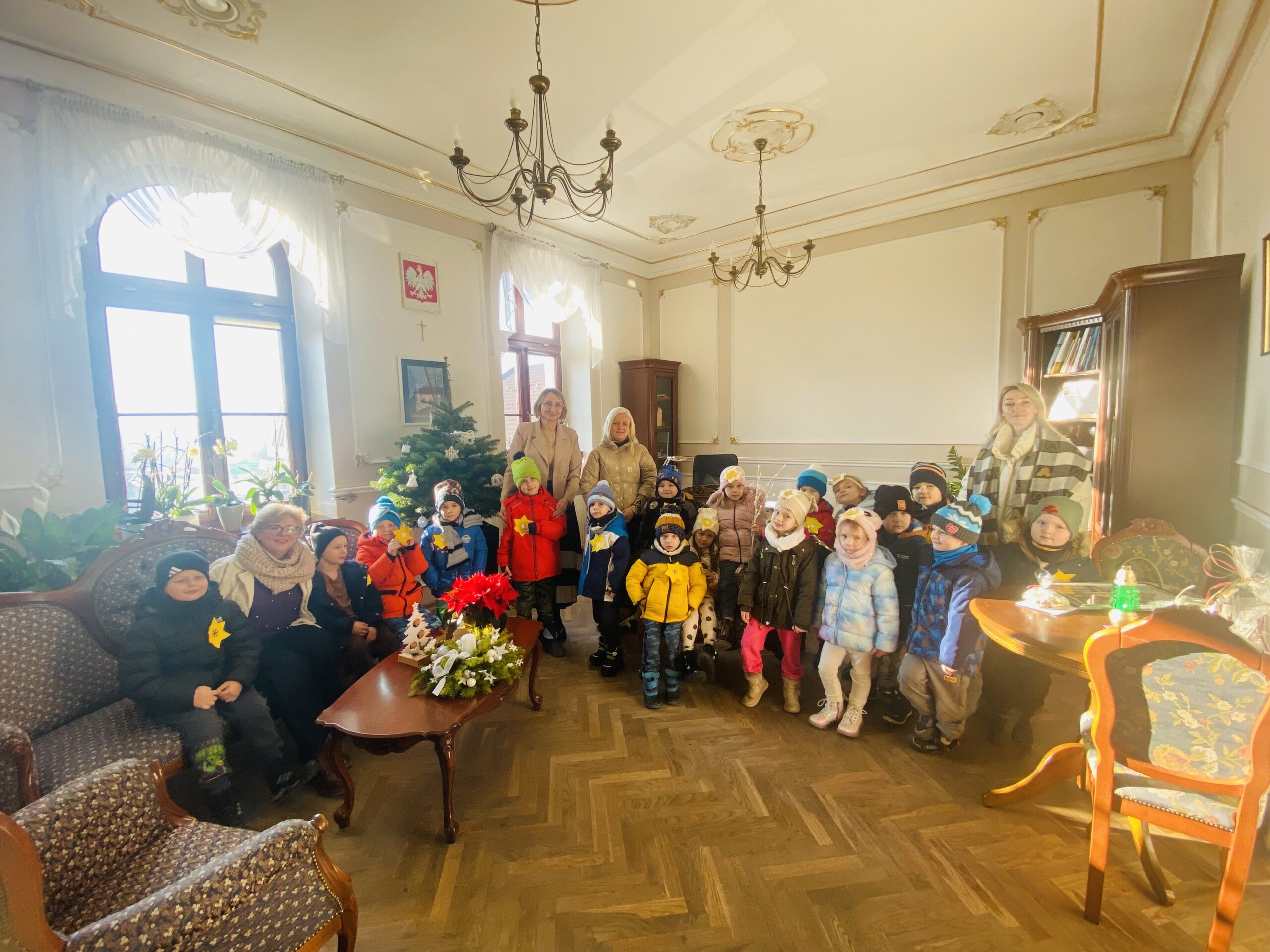 Przedszkolaki z naszego przedszkola odwiedziły Urząd Miejski oraz Gminny Zarząd Oświaty. Podczas wizyty dzieci wspólnie kolędowały, składały świąteczne życzenia i z radością dzieliły się bożonarodzeniową atmosferą. Była to mila i wartościowa lekcja poznawania lokalnych instytucji oraz okazja do integracji ze społecznością gminną.