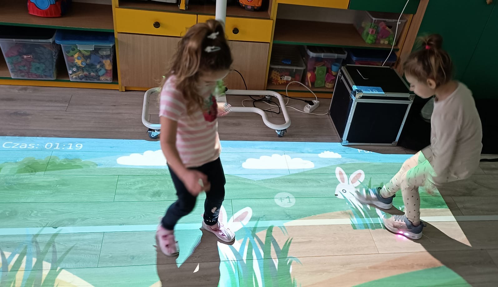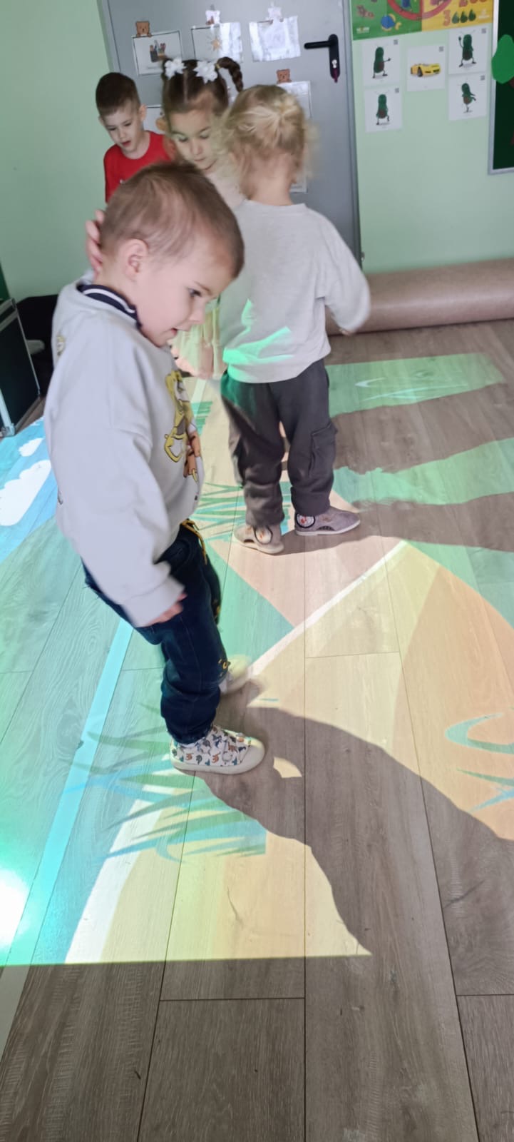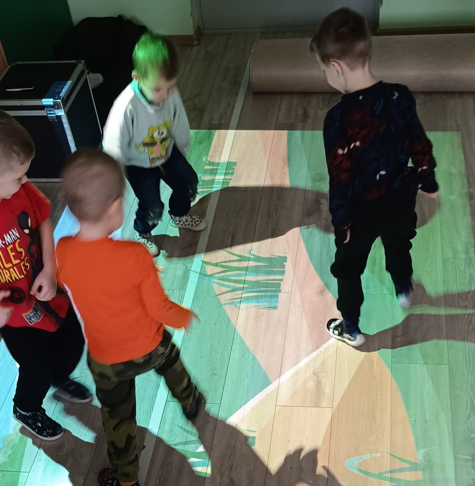 Przedszkolaki z radością uczestniczyły w zabawach z dywanem interaktywnym, które łączyły ruch, naukę i zabawę. Zajęcia rozwijały spostrzegawczość, refleks i współpracę w grupie.