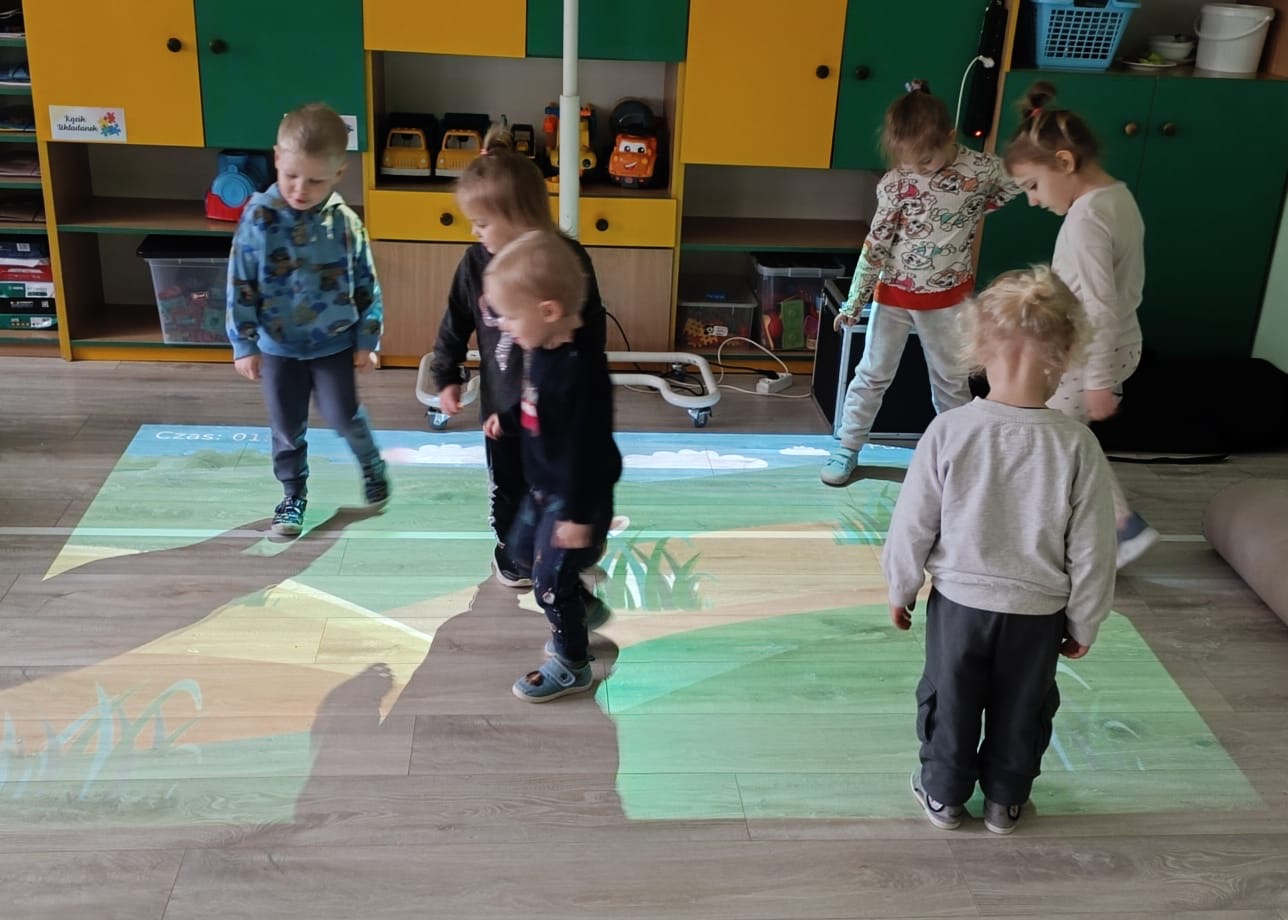 Przedszkolaki z radością uczestniczyły w zabawach z dywanem interaktywnym, które łączyły ruch, naukę i zabawę. Zajęcia rozwijały spostrzegawczość, refleks i współpracę w grupie.