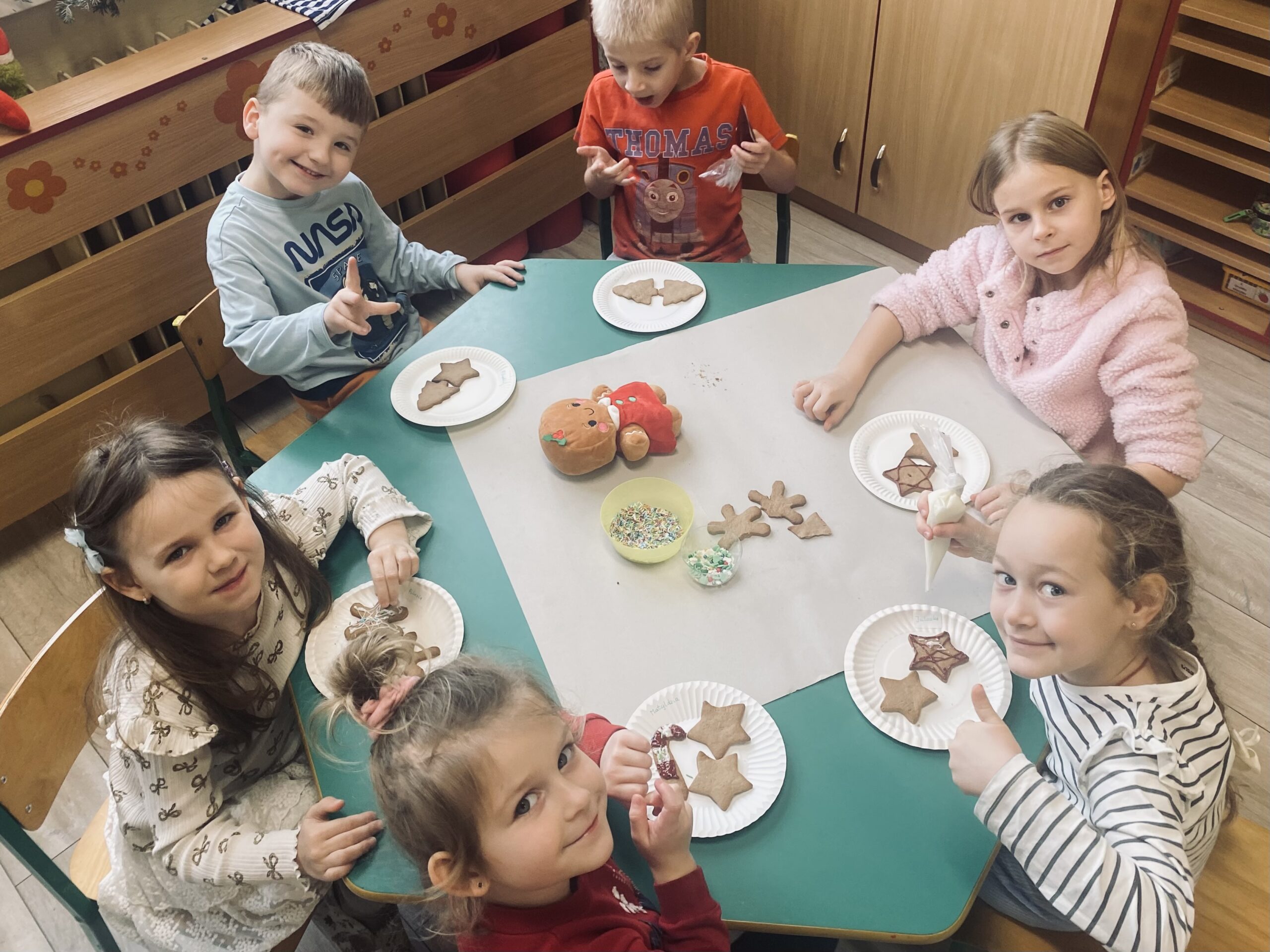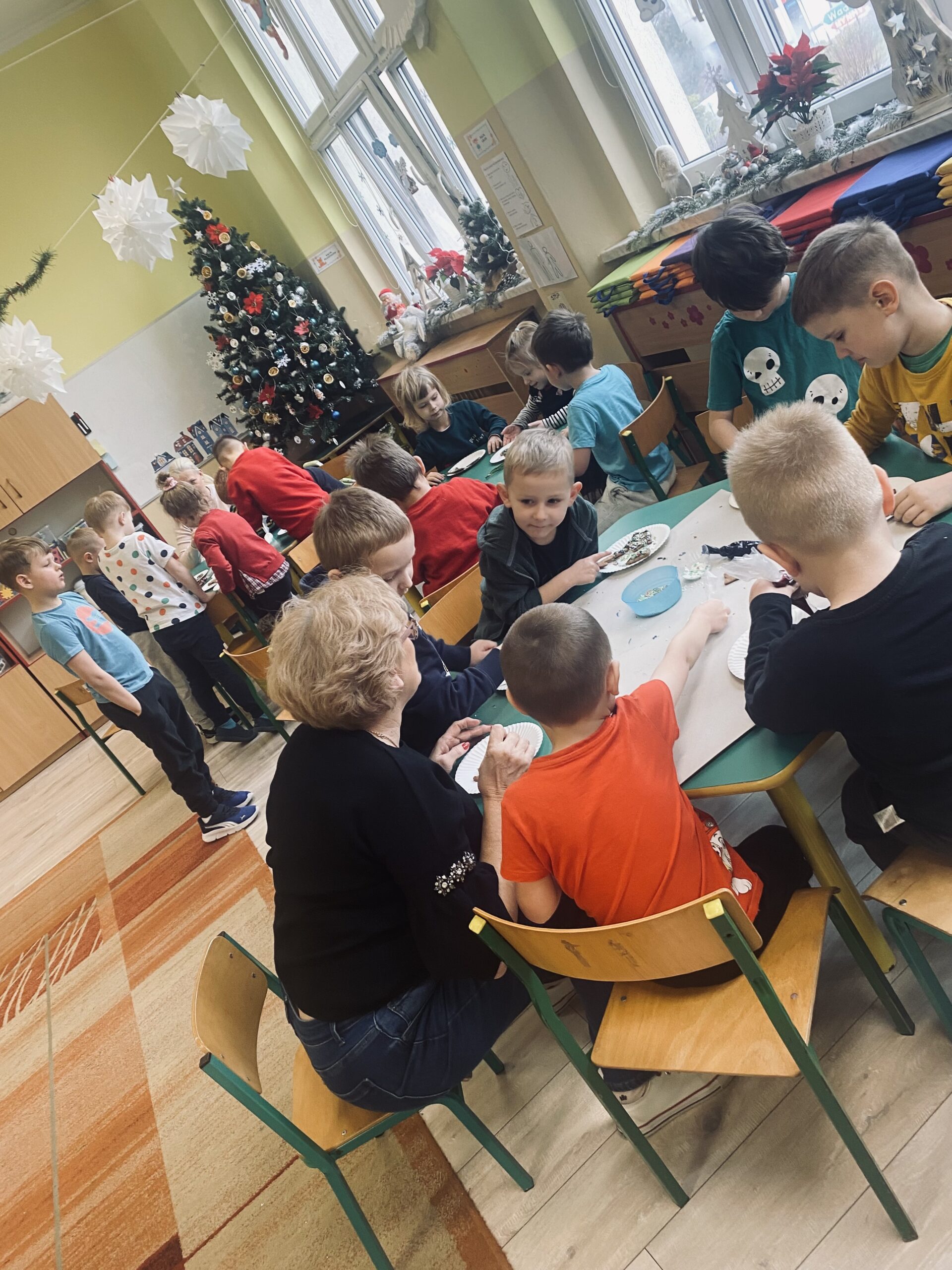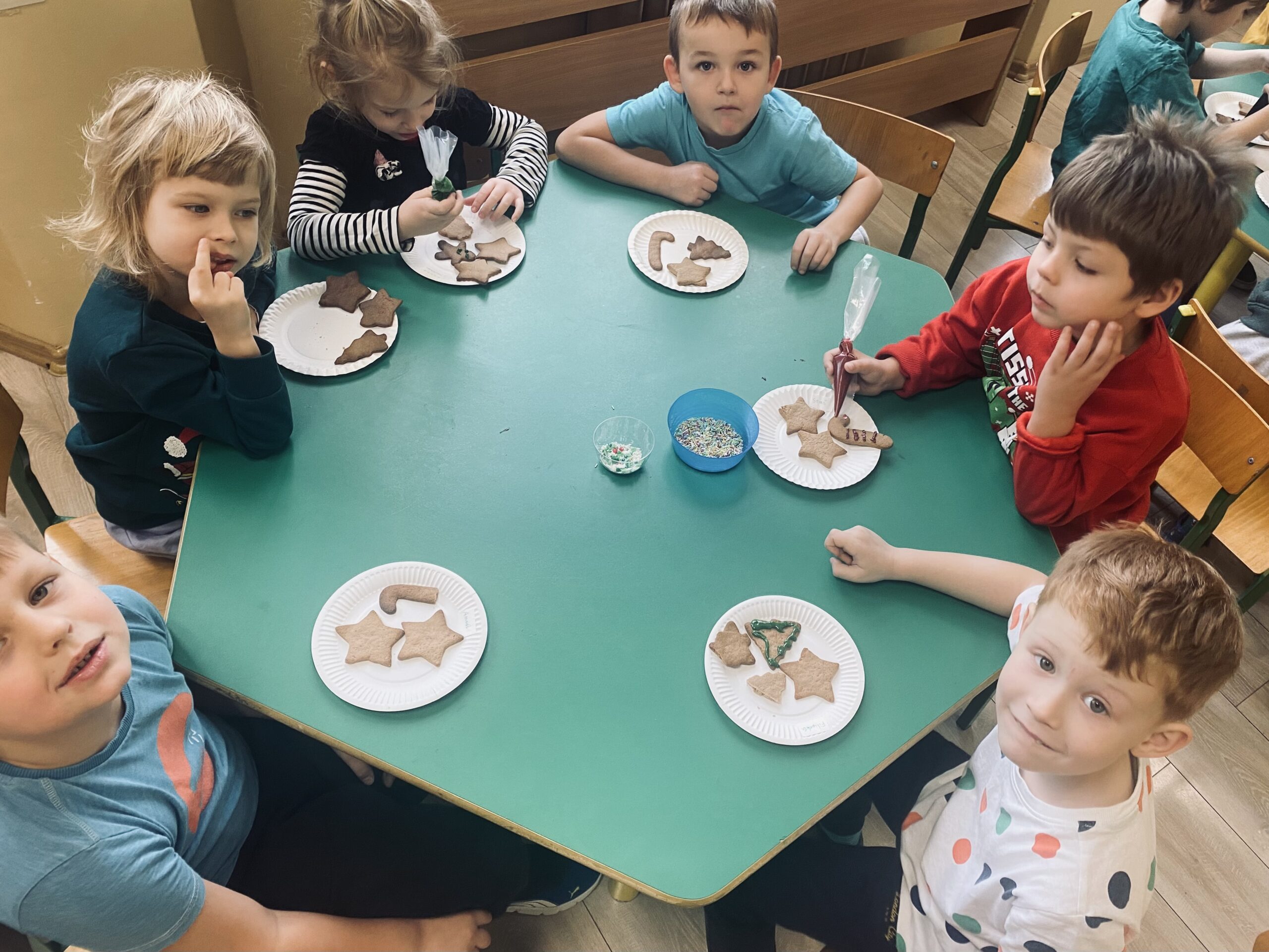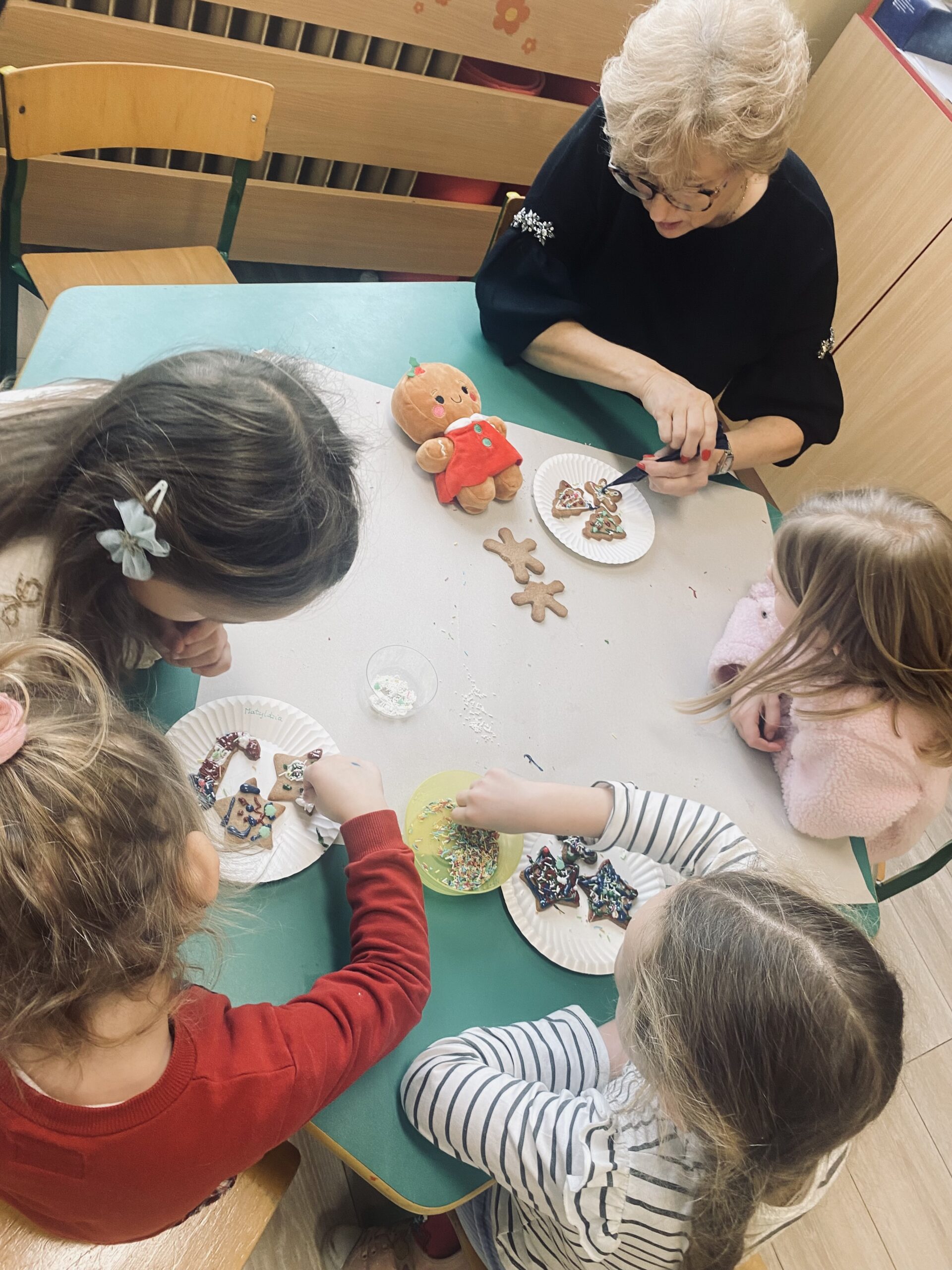 Podczas zajęć przedszkolaki z wielkim zaangażowaniem i radością zdobiły świąteczne pierniczki. Dzieci rozwijały swoją kreatywność, ćwiczyły sprawność manualną oraz współpracę, tworząc kolorowe i pachnące wypieki. Miłym wydarzeniem była wizyta Pani Dyrektor, która dołączyła do dzieci i wspólnie z nimi dekorowała pierniczki.