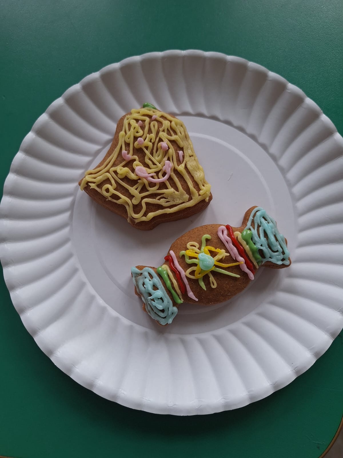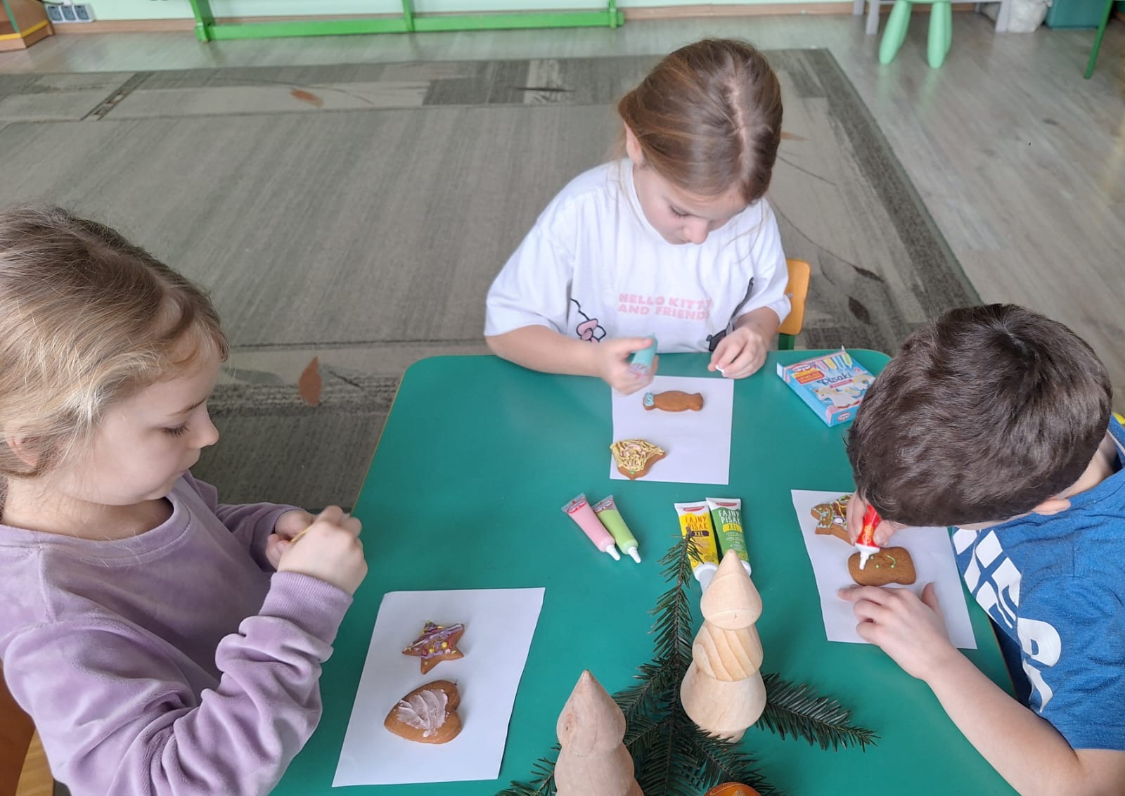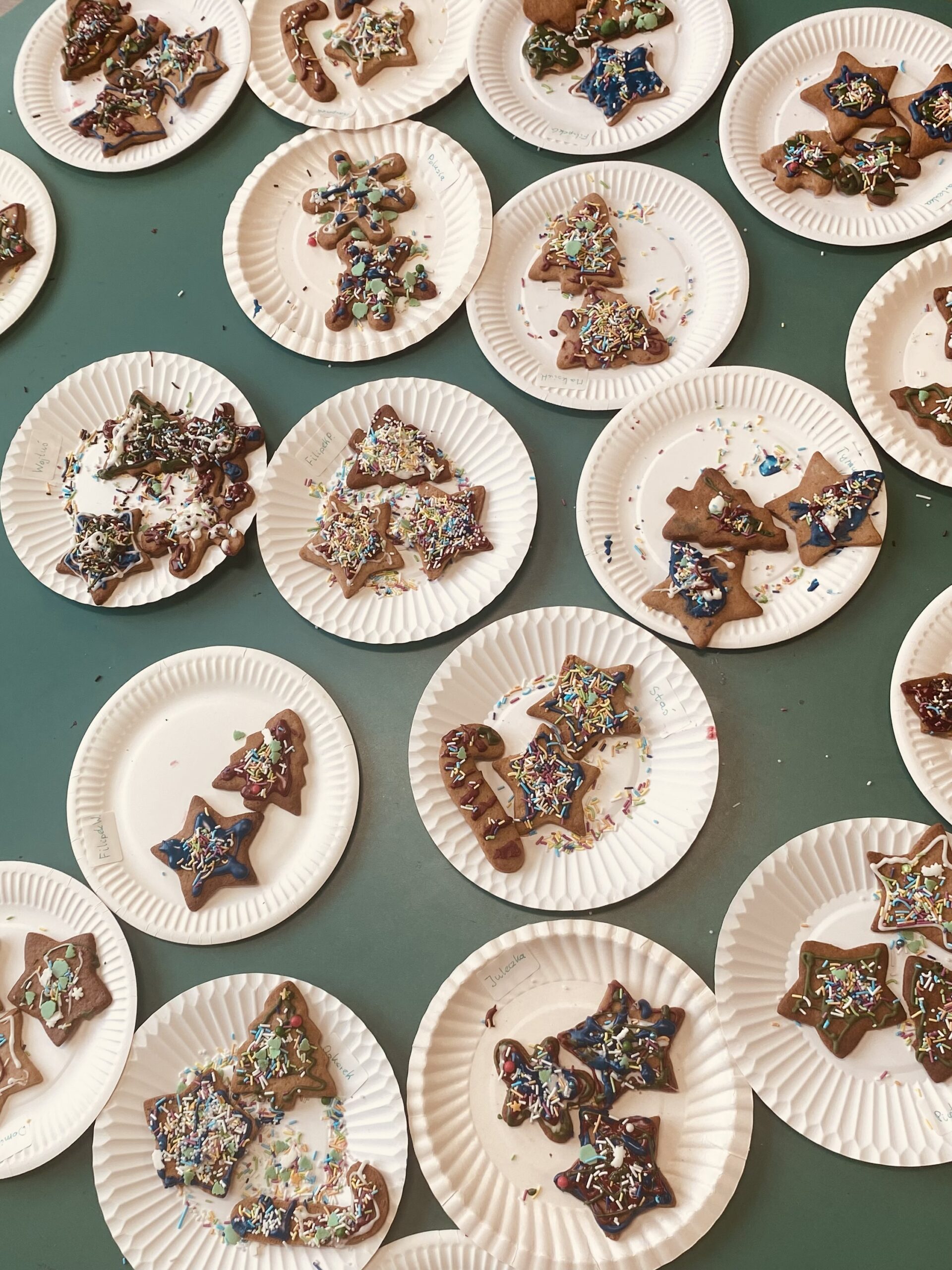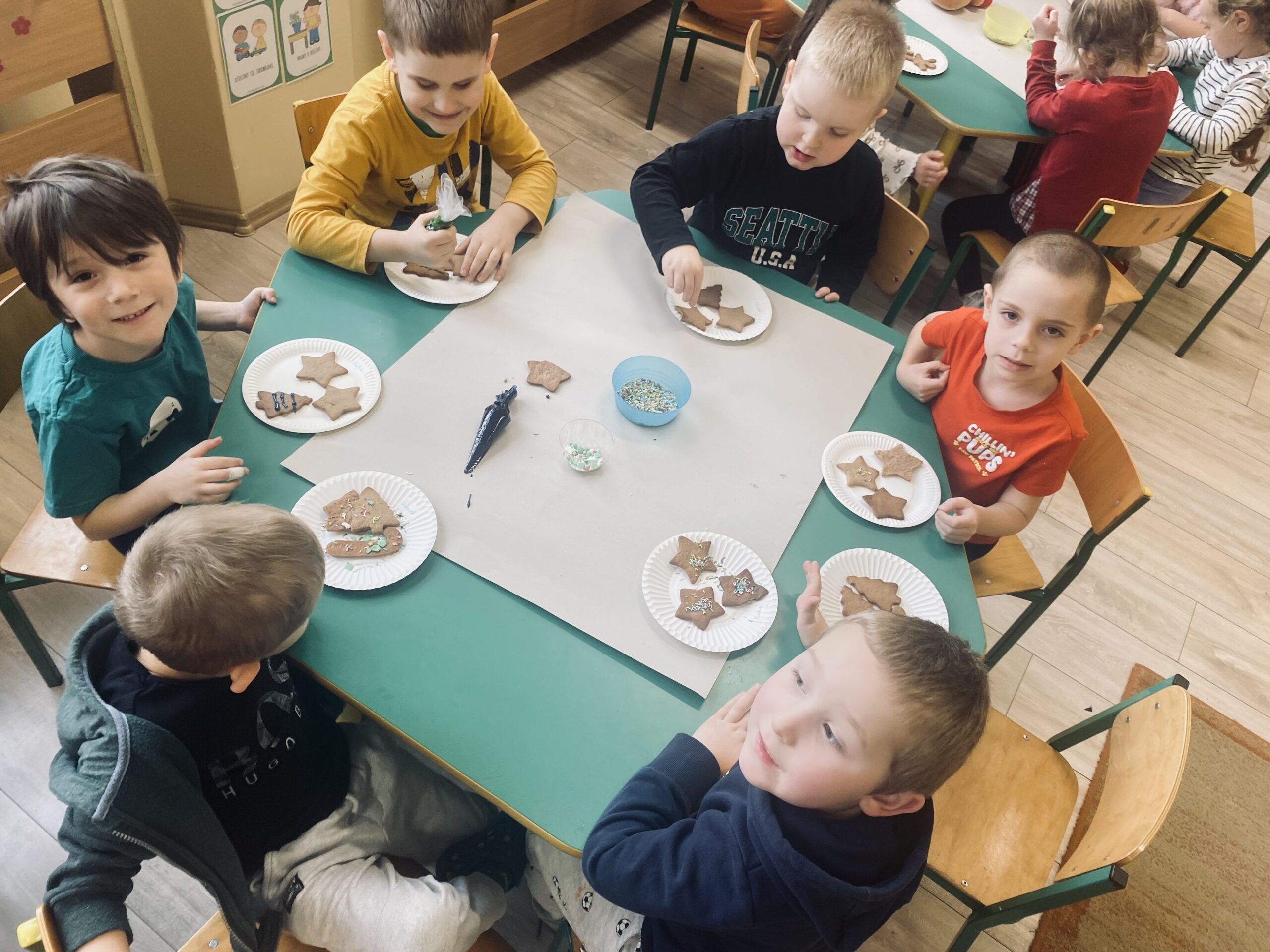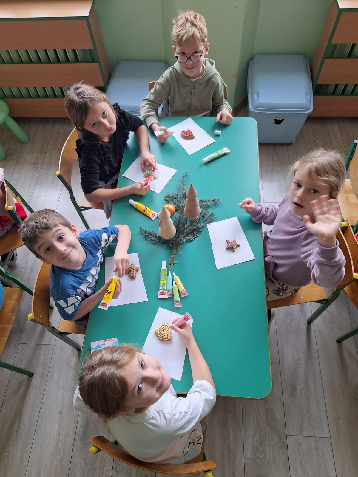 Podczas zajęć przedszkolaki z wielkim zaangażowaniem i radością zdobiły świąteczne pierniczki. Dzieci rozwijały swoją kreatywność, ćwiczyły sprawność manualną oraz współpracę, tworząc kolorowe i pachnące wypieki. Miłym wydarzeniem była wizyta Pani Dyrektor, która dołączyła do dzieci i wspólnie z nimi dekorowała pierniczki.